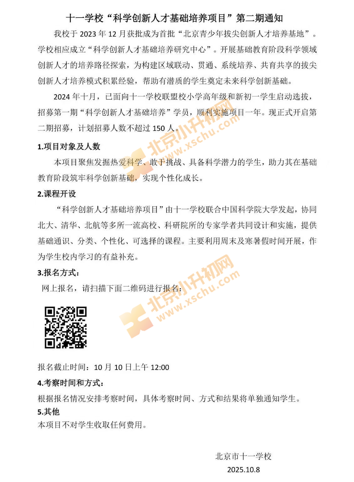 十一学校第二期科学创新人才基础培养项目对象、课程开设、报名方式、考察时间发布!十一学校“科学创新人才基础培养项目”第二期通知发布!项目对象、课程开设、报名方式、考察时间等如下: