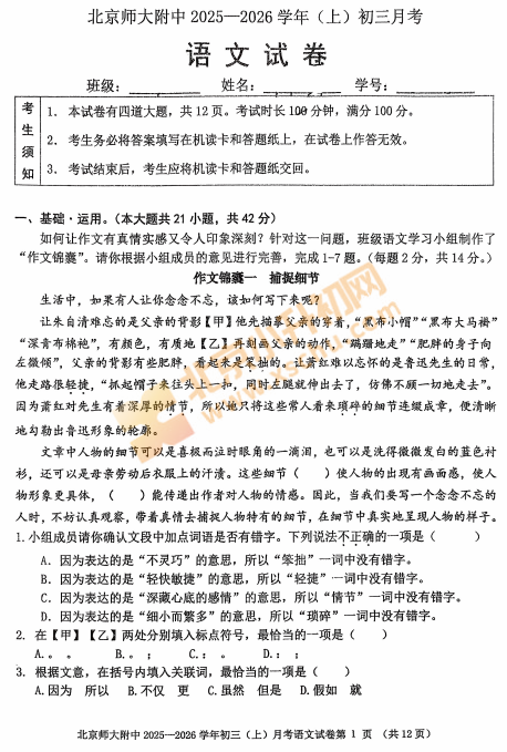 2025北京北师大附中初三10月月考语文试卷及答案已发布,点击本文可查看、下载完整版试卷及答案。2025北京北师大附中初三10月月考语文试卷及答案发布,北京小升初网分享,供大家可下载查看!各区初中校月考试卷可点击下方↓图片,打包下载。