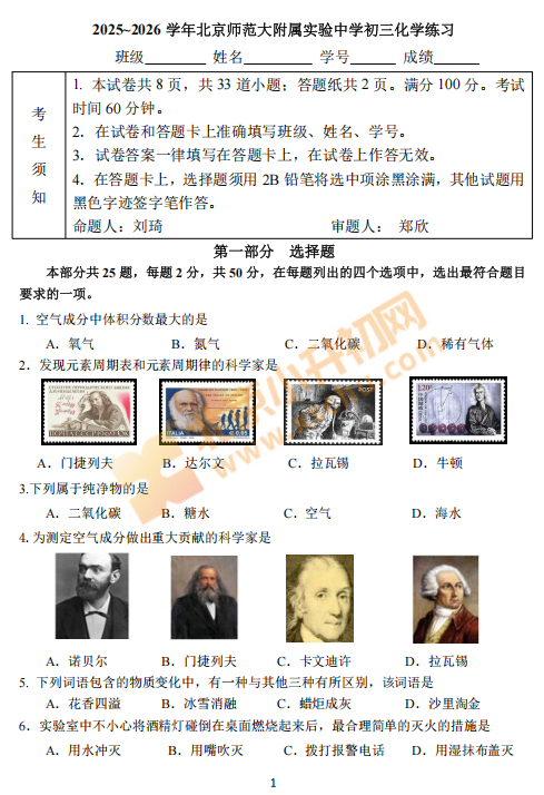 2025北京北师大实验中学初三10月月考化学试卷及答案已发布,点击本文可查看、下载完整版试卷及答案。2025北京北师大实验中学初三10月月考化学试卷及答案发布,北京小升初网分享,供大家可下载查看!各区初中校月考试卷可点击下方↓图片,打包下载。