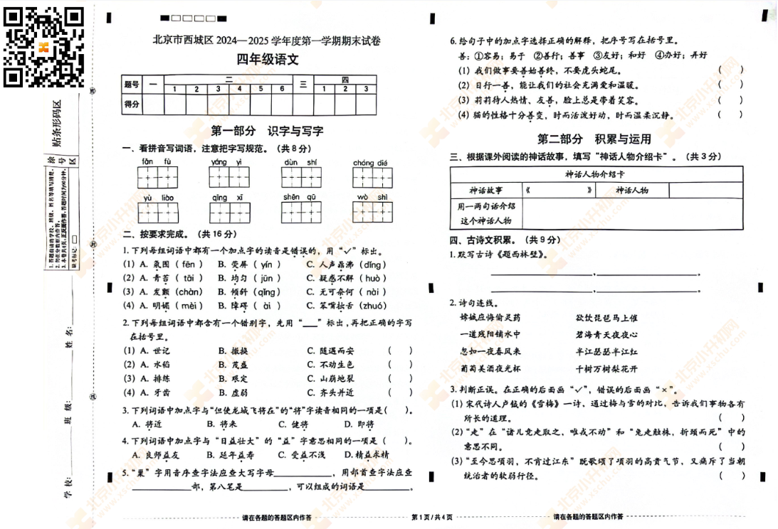 2025-2026学年(上)西城区小学4年级语文期末试题预计在2026年1月出炉!家长可先下载去年期末试题,练习提升!新试卷公布后将更新在本页面,建议(Ctrl+D)收藏本页面!