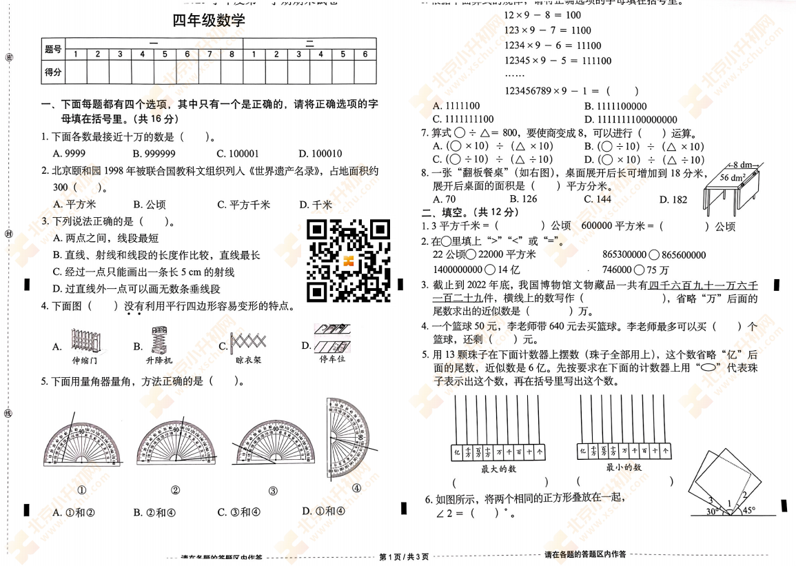 2025-2026学年(上)西城区小学4年级数学期末试题预计在2026年1月出炉!家长可先下载去年期末试题,练习提升!新试卷公布后将更新在本页面,建议(Ctrl+D)收藏本页面!