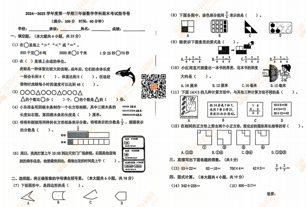 2025-2026学年(上)西城区小学3年级数学期末试题预计在2026年1月出炉!家长可先下载去年期末试题,练习提升!新试卷公布后将更新在本页面,建议(Ctrl+D)收藏本页面!