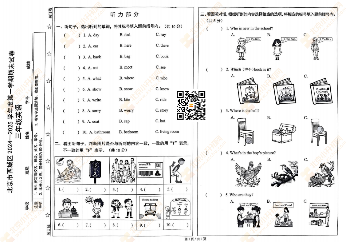 2025-2026学年(上)西城区小学3年级英语期末试题预计在2026年1月出炉!家长可先下载去年期末试题,练习提升!新试卷公布后将更新在本页面,建议(Ctrl+D)收藏本页面!