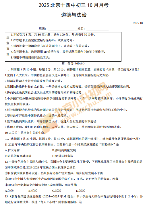 2025北京十四中初三10月月考道德与法治试卷及答案已发布,点击本文可查看、下载完整版试卷。2025北京十四中初三10月月考道德与法治试卷及答案发布,北京小升初网分享,供大家可下载查看!各区初中校月考试卷可点击下方↓图片,打包下载。