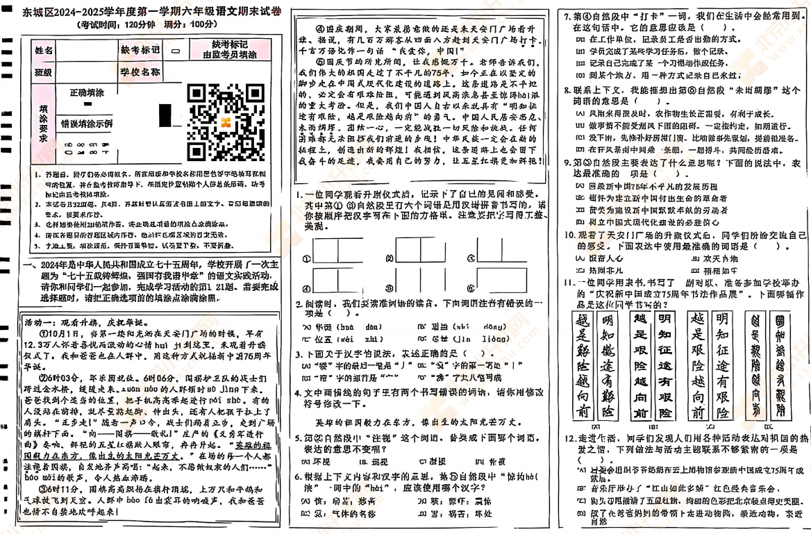 2025-2026学年(上)东城区小学六年级语文期末试题预计在2026年1月出炉!家长可先下载去年期末试题,练习提升!新试卷公布后将更新在本页面,建议(Ctrl+D)收藏本页面!