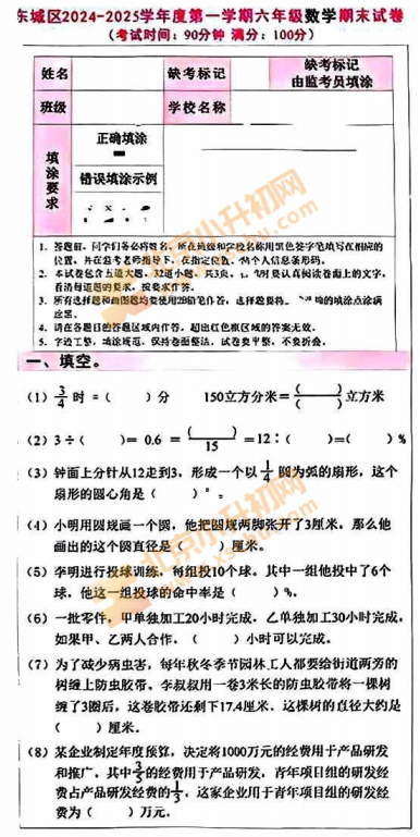 2025-2026学年(上)东城区小学六年级数学期末试题预计在2026年1月出炉!家长可先下载去年期末试题,练习提升!新试卷公布后将更新在本页面,建议(Ctrl+D)收藏本页面!