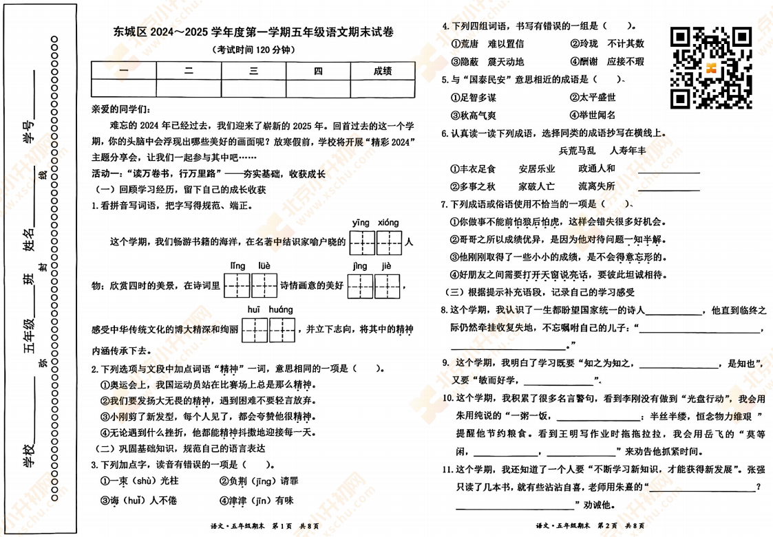2025-2026学年(上)东城区小学五年级语文期末试题预计在2026年1月出炉!家长可先下载去年期末试题,练习提升!新试卷公布后将更新在本页面,建议(Ctrl+D)收藏本页面!