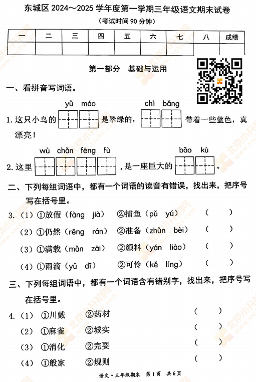 2025-2026学年(上)东城区小学三年级语文期末试题预计在2026年1月出炉!家长可先下载去年期末试题,练习提升!新试卷公布后将更新在本页面,建议(Ctrl+D)收藏本页面!