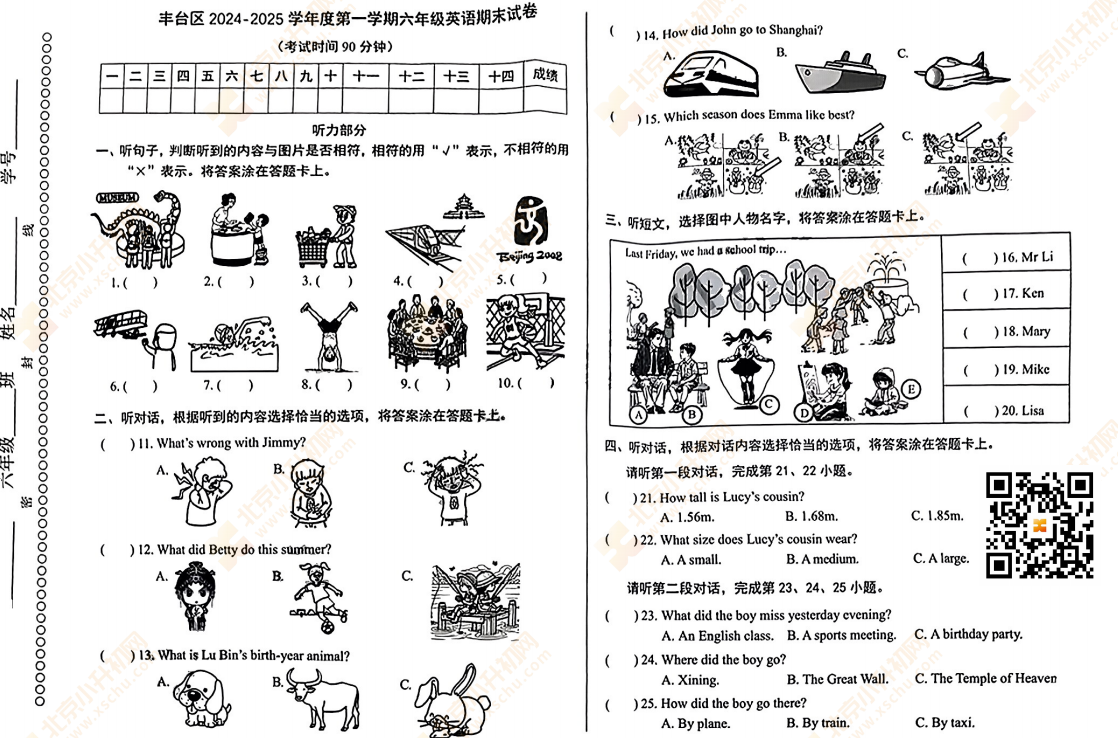 2025-2026学年(上)丰台区小学六年级英语期末试题预计在2026年1月出炉!家长可先下载去年期末试题,练习提升!新试卷公布后将更新在本页面,建议(Ctrl+D)收藏本页面!