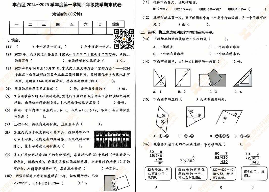 2025-2026学年(上)丰台区小学四年级数学期末试题预计在2026年1月出炉!家长可先下载去年期末试题,练习提升!新试卷公布后将更新在本页面,建议(Ctrl+D)收藏本页面!