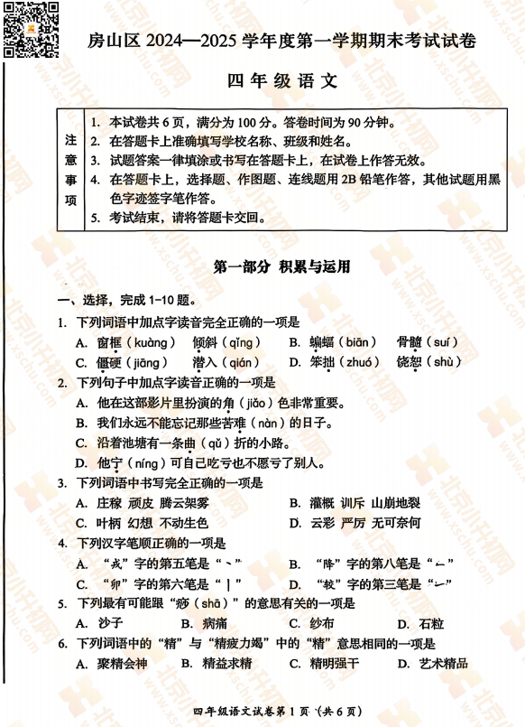 2025-2026学年(上)房山区小学四年级语文期末试题预计在2026年1月出炉!家长可先下载去年期末试题,练习提升!新试卷公布后将更新在本页面,建议(Ctrl+D)收藏本页面!