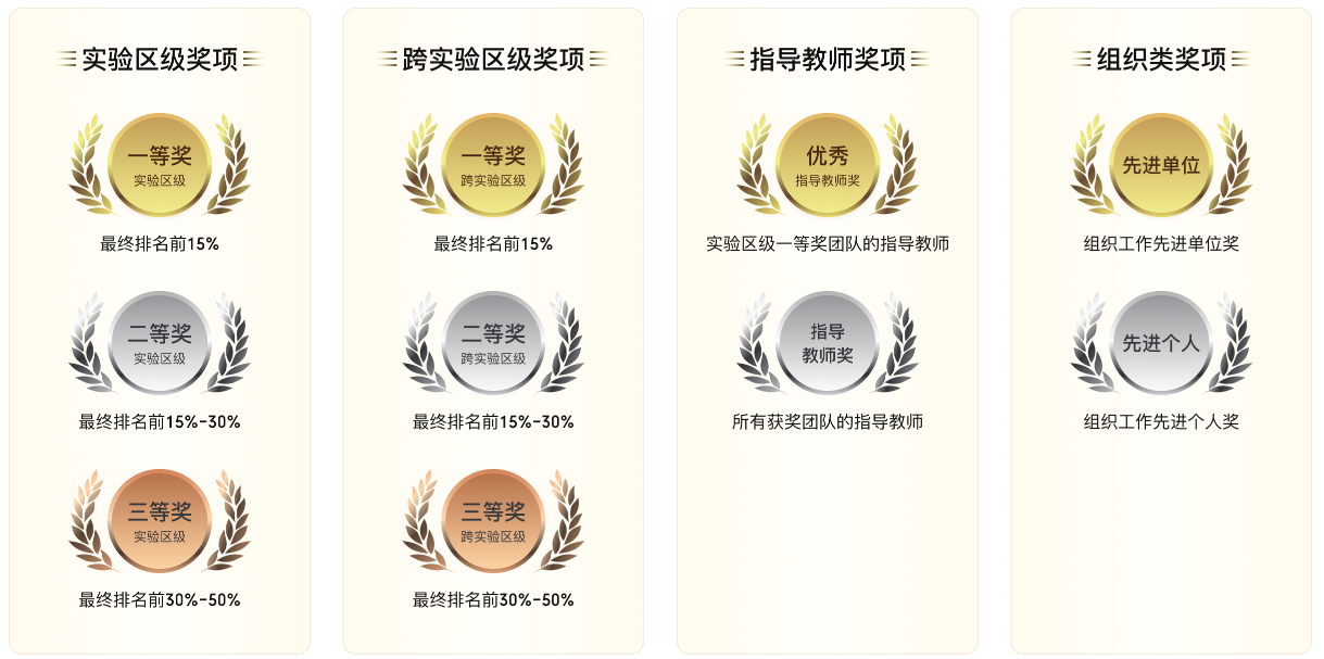 通过大赛官网免费报名,个人或团队(≤3人)按组别选择比赛分项参与。初赛线上形式,在各区内比赛,颁发实验区级奖项。决赛线下形式,跨区比赛,颁发跨实验区级奖项。