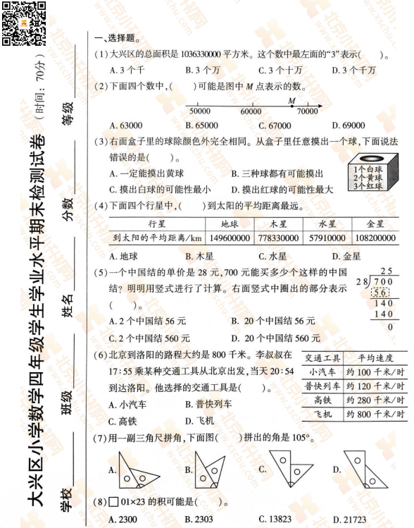 2025-2026学年(上)大兴区小学四年级数学期末试题预计在2026年1月出炉!家长可先下载去年期末试题,练习提升!新试卷公布后将更新在本页面,建议(Ctrl+D)收藏本页面!