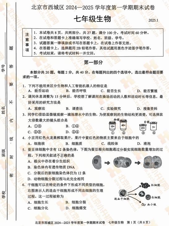 2025-2026学年(上)西城区初一期末生物试卷及答案预计在2026年1月出炉!家长可先下载去年期末试题,练习提升!新试卷公布后将更新在本页面,建议(Ctrl+D)收藏本页面!