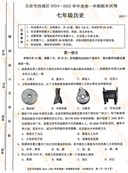 2025-2026学年(上)西城区初一期末历史试卷及答案预计在2026年1月出炉!家长可先下载去年期末试题,练习提升!新试卷公布后将更新在本页面,建议(Ctrl+D)收藏本页面!