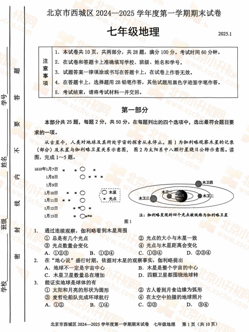2025-2026学年(上)西城区初一期末地理试卷及答案预计在2026年1月出炉!家长可先下载去年期末试题,练习提升!新试卷公布后将更新在本页面,建议(Ctrl+D)收藏本页面!
