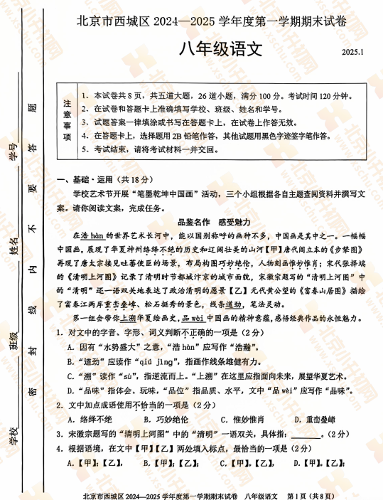 西城区2025-2026学年第一学期初二期末语文试卷及答案什么时候出?考哪些内容?如何下载?