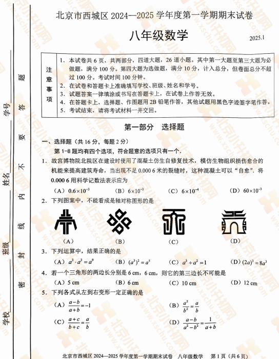 2025-2026学年(上)西城区初二期末数学试卷及答案预计在2026年1月出炉!家长可先下载去年期末试题,练习提升!新试卷公布后将更新在本页面,建议(Ctrl+D)收藏本页面!
