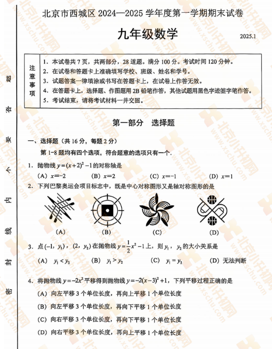 2025-2026学年(上)西城区初三期末数学试卷及答案预计在2026年1月出炉!家长可先下载去年期末试题,练习提升!新试卷公布后将更新在本页面,建议(Ctrl+D)收藏本页面!