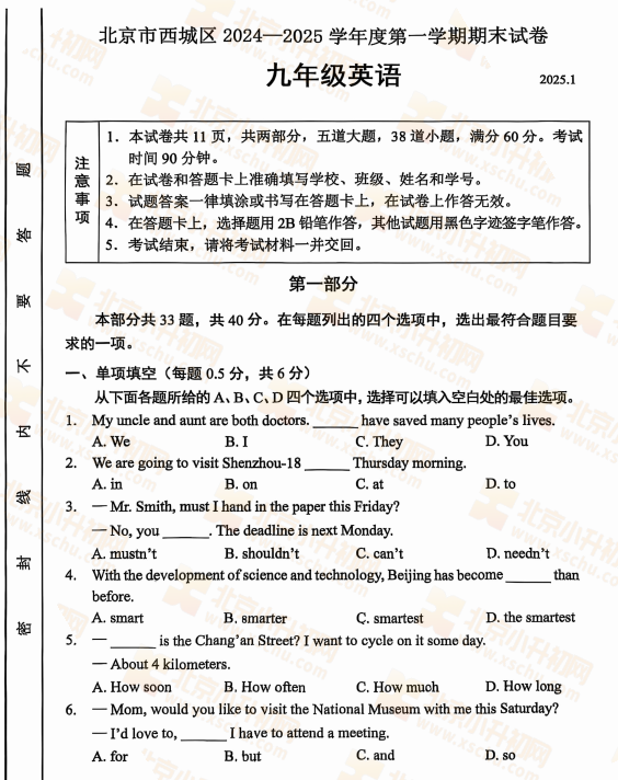 2025-2026学年(上)西城区初三期末英语试卷及答案预计在2026年1月出炉!家长可先下载去年期末试题,练习提升!新试卷公布后将更新在本页面,建议(Ctrl+D)收藏本页面!