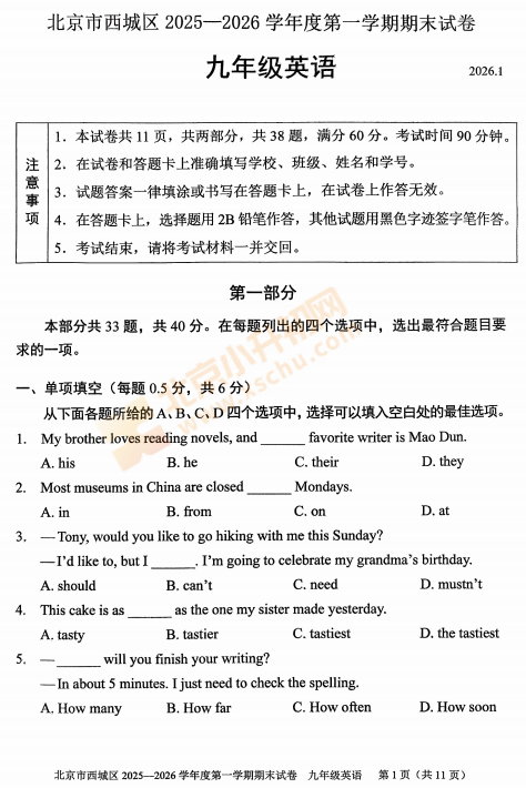 西城区2025-2026学年第一学期初三期末英语试卷及答案什么时候出?考哪些内容?如何下载?