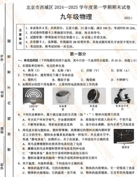 2025-2026学年(上)西城区初三期末物理试卷及答案预计在2026年1月出炉!家长可先下载去年期末试题,练习提升!新试卷公布后将更新在本页面,建议(Ctrl+D)收藏本页面!