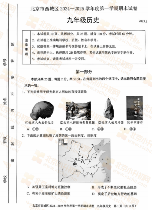 2025-2026学年(上)西城区初三期末历史试卷及答案预计在2026年1月出炉!家长可先下载去年期末试题,练习提升!新试卷公布后将更新在本页面,建议(Ctrl+D)收藏本页面!