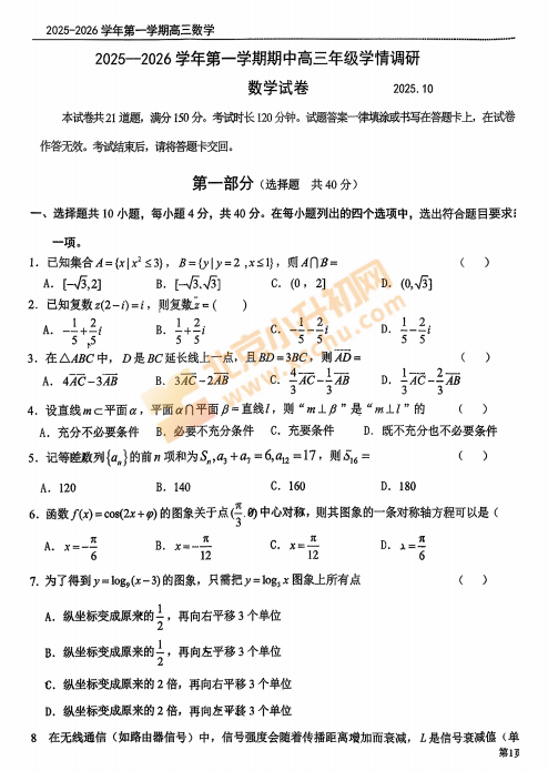 2025-2026学年第一学期昌平一中高三期中数学试卷及答案什么时候出?考哪些内容?如何下载?