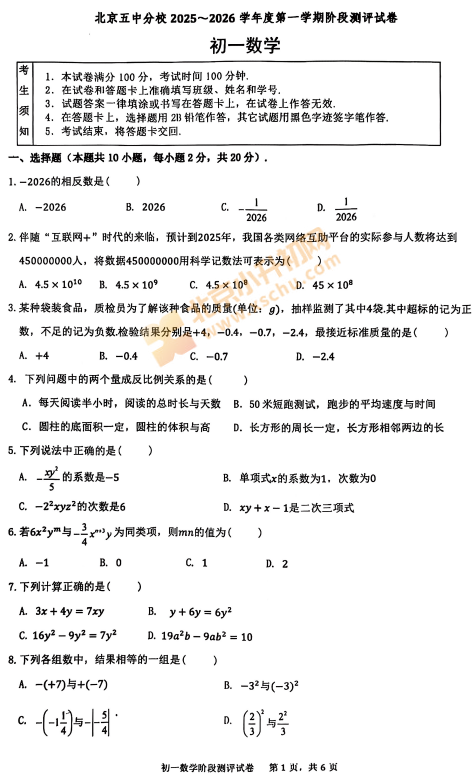2025-2026学年第一学期北京五中分校初一期中数学试卷及答案什么时候出?考哪些内容?如何下载?