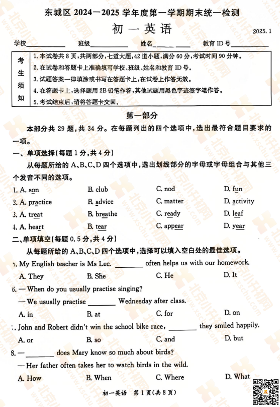 2025-2026学年(上)东城区初一期末英语试卷及答案预计在2026年1月出炉!家长可先下载去年期末试题,练习提升!新试卷公布后将更新在本页面,建议(Ctrl+D)收藏本页面!