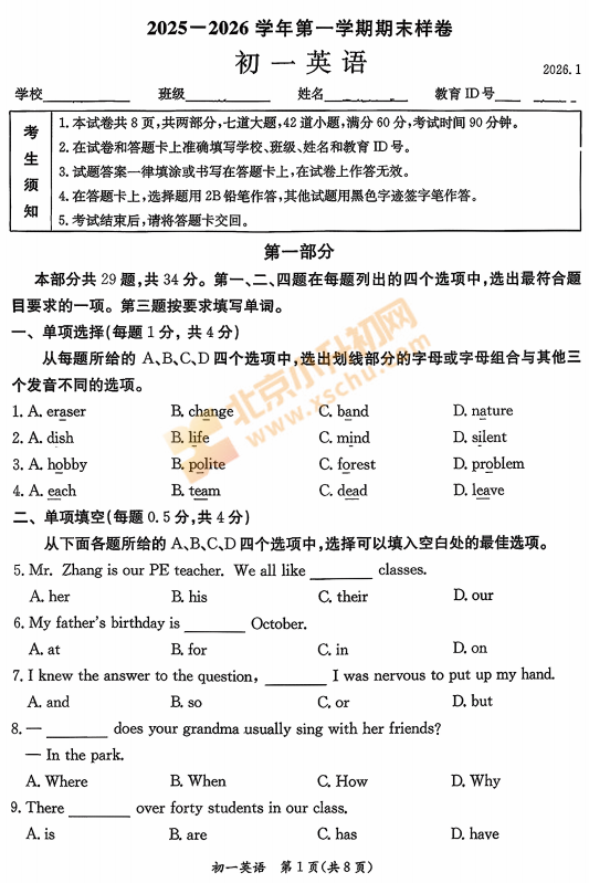 东城区2025-2026学年第一学期初一期末英语试卷及答案什么时候出?考哪些内容?如何下载?