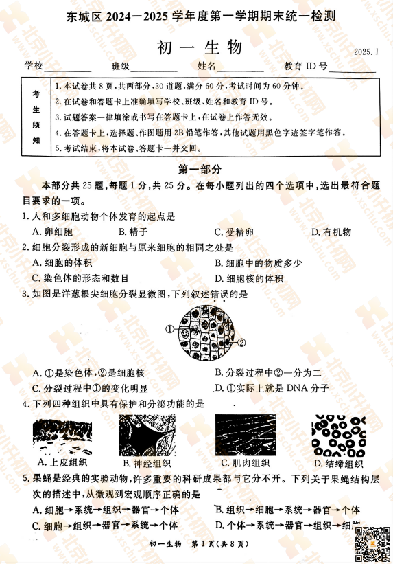 2025-2026学年(上)东城区初一期末生物试卷及答案预计在2026年1月出炉!家长可先下载去年期末试题,练习提升!新试卷公布后将更新在本页面,建议(Ctrl+D)收藏本页面!