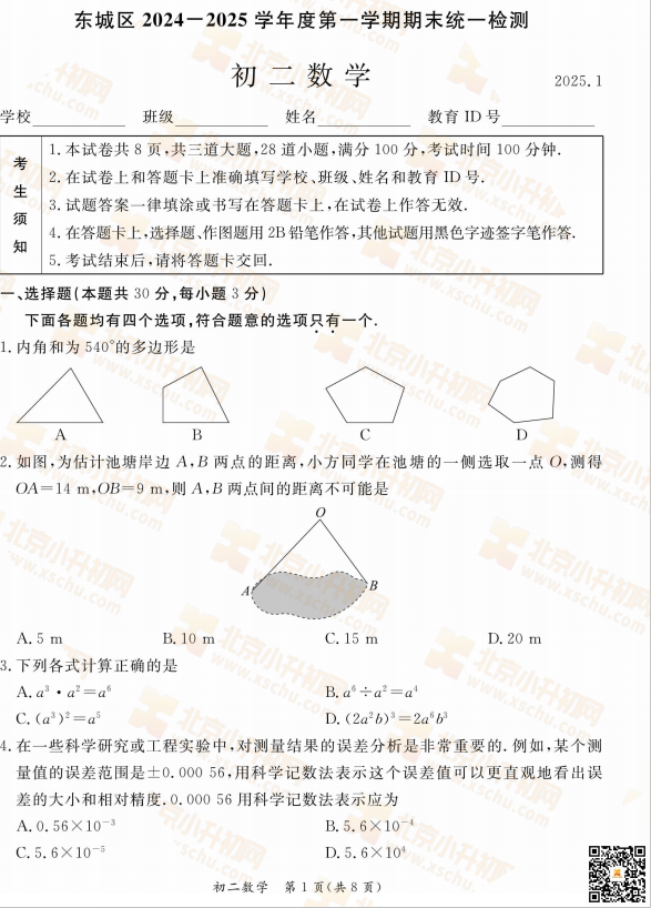 2025-2026学年(上)东城区初二期末数学试卷及答案预计在2026年1月出炉!家长可先下载去年期末试题,练习提升!新试卷公布后将更新在本页面,建议(Ctrl+D)收藏本页面!