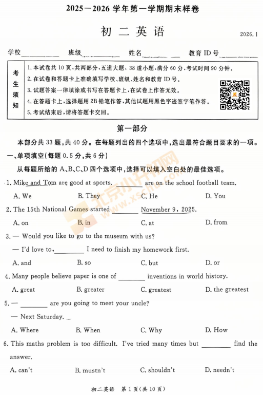 东城区2025-2026学年第一学期初二期末英语试卷及答案什么时候出?考哪些内容?如何下载?