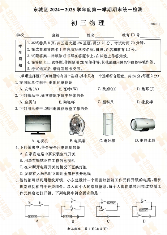 2025-2026学年(上)东城区初三期末物理试卷及答案预计在2026年1月出炉!家长可先下载去年期末试题,练习提升!新试卷公布后将更新在本页面,建议(Ctrl+D)收藏本页面!