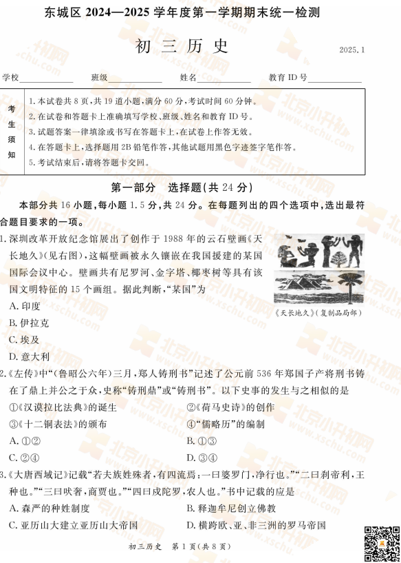 2025-2026学年(上)东城区初三期末历史试卷及答案预计在2026年1月出炉!家长可先下载去年期末试题,练习提升!新试卷公布后将更新在本页面,建议(Ctrl+D)收藏本页面!