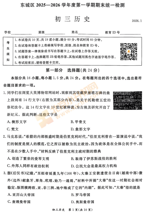 东城区2025-2026学年第一学期初三期末历史试卷及答案什么时候出?考哪些内容?如何下载?