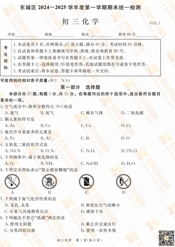 2025-2026学年(上)东城区初三期末化学试卷及答案预计在2026年1月出炉!家长可先下载去年期末试题,练习提升!新试卷公布后将更新在本页面,建议(Ctrl+D)收藏本页面!