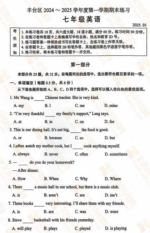 2025-2026学年(上)丰台区初一期末英语试卷及答案预计在2026年1月出炉!家长可先下载去年期末试题,练习提升!新试卷公布后将更新在本页面,建议(Ctrl+D)收藏本页面!