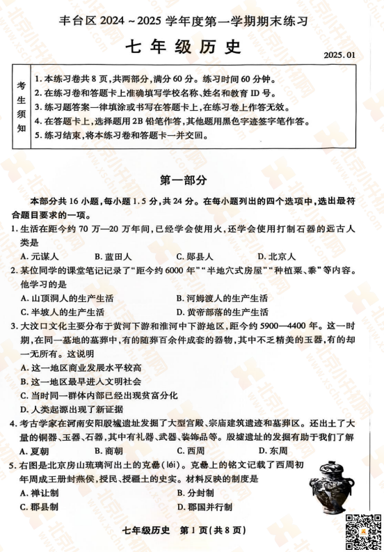 2025-2026学年(上)丰台区初一期末历史试卷及答案预计在2026年1月出炉!家长可先下载去年期末试题,练习提升!新试卷公布后将更新在本页面,建议(Ctrl+D)收藏本页面!