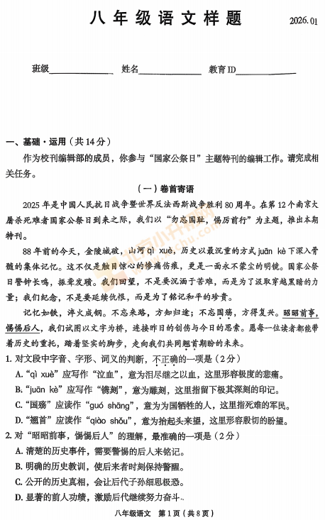 2025-2026学年(上)丰台区初二期末语文试卷已出炉!下载完整版试卷请点击文末pdf文件!或点击下方图片↓打包下载2026年北京各区初中期末试卷!