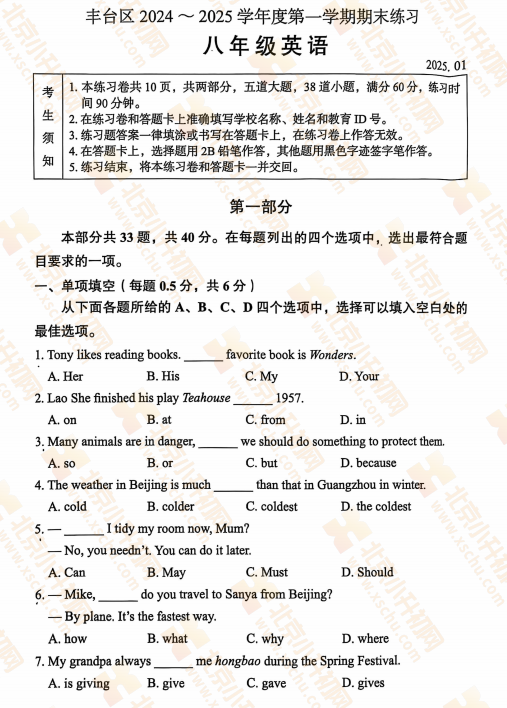 2025-2026学年(上)丰台区初二期末英语试卷及答案预计在2026年1月出炉!家长可先下载去年期末试题,练习提升!新试卷公布后将更新在本页面,建议(Ctrl+D)收藏本页面!