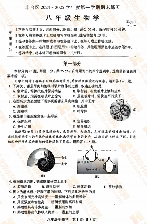 2025-2026学年(上)丰台区初二期末生物试卷及答案预计在2026年1月出炉!家长可先下载去年期末试题,练习提升!新试卷公布后将更新在本页面,建议(Ctrl+D)收藏本页面!