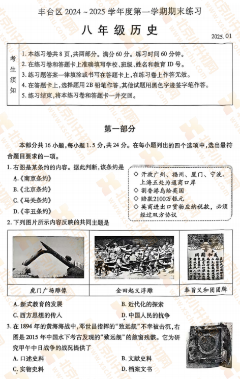 2025-2026学年(上)丰台区初二期末历史试卷及答案预计在2026年1月出炉!家长可先下载去年期末试题,练习提升!新试卷公布后将更新在本页面,建议(Ctrl+D)收藏本页面!