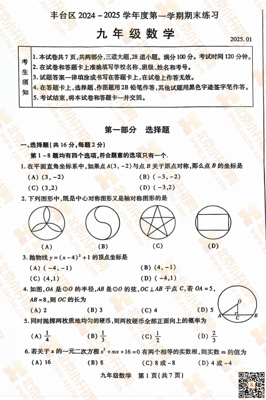 2025-2026学年(上)丰台区初三期末数学试卷及答案预计在2026年1月出炉!家长可先下载去年期末试题,练习提升!新试卷公布后将更新在本页面,建议(Ctrl+D)收藏本页面!