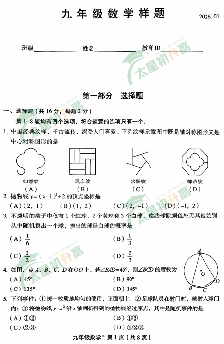 丰台区2025-2026学年第一学期初三期末数学试卷及答案什么时候出?考哪些内容?如何下载?