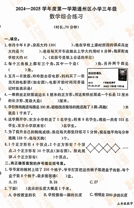 2025-2026学年(上)通州区小学三年级数学期末试题预计在2026年1月出炉!家长可先下载去年期末试题,练习提升!新试卷公布后将更新在本页面,建议(Ctrl+D)收藏本页面!