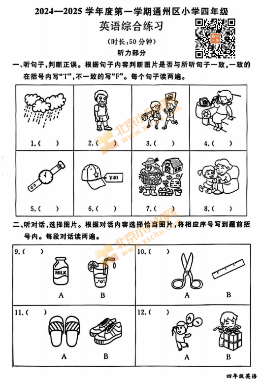 2025-2026学年(上)通州区小学四年级英语期末试题预计在2026年1月出炉!家长可先下载去年期末试题,练习提升!新试卷公布后将更新在本页面,建议(Ctrl+D)收藏本页面!