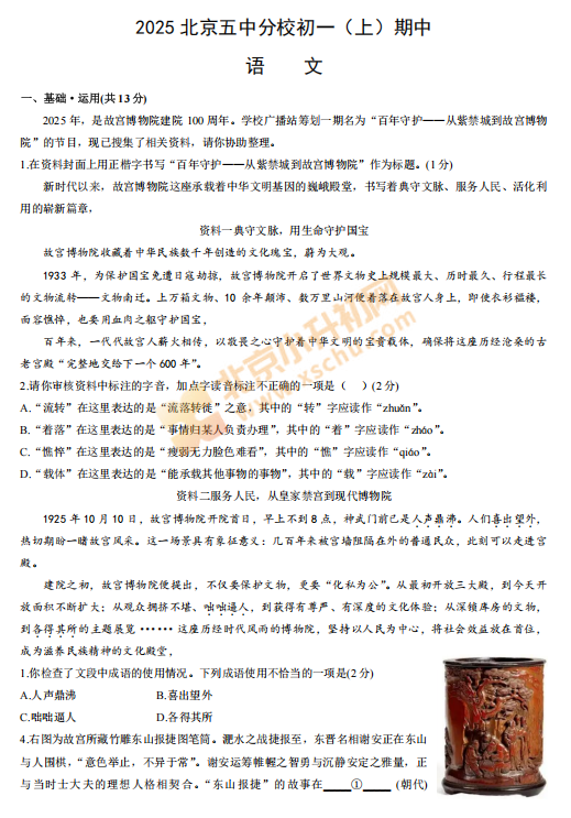 2025-2026学年第一学期北京五中分校初一期中语文试卷及答案什么时候出?考哪些内容?如何下载?