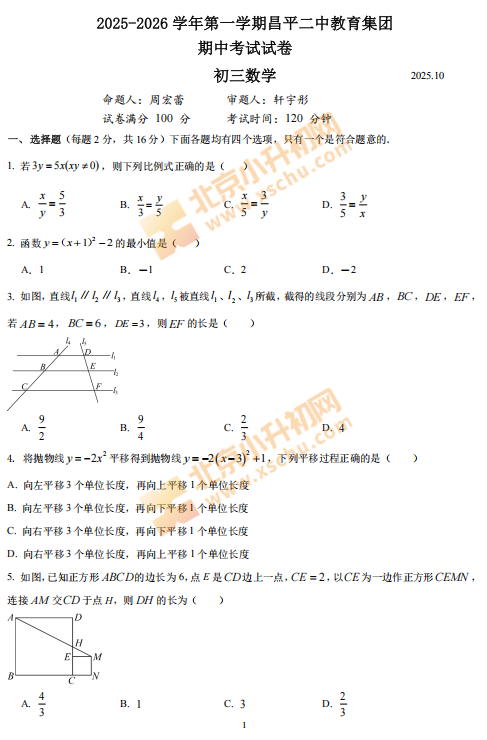 2025-2026学年第一学期北京昌平二中初三期中数学试卷及答案什么时候出?考哪些内容?如何下载?